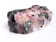 Rhodonite is a manganese inosilicate, (Mn, Fe, Mg, Ca)SiO3 and member of the pyroxenoid group of minerals, crystallizing in the triclinic system. It commonly occurs as cleavable to compact masses with a rose-red color (the name comes from the Greek ?üäïò rhodos, rosy), often tending to brown because of surface oxidation.