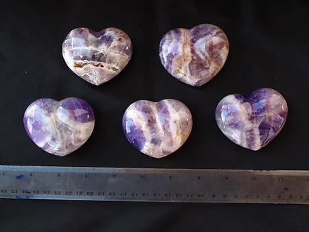 Hearts are approximately 2" wide and weigh 90 g.  The Banded Amethyst Heart(s) you will receive is (are) similar to what is photographed.