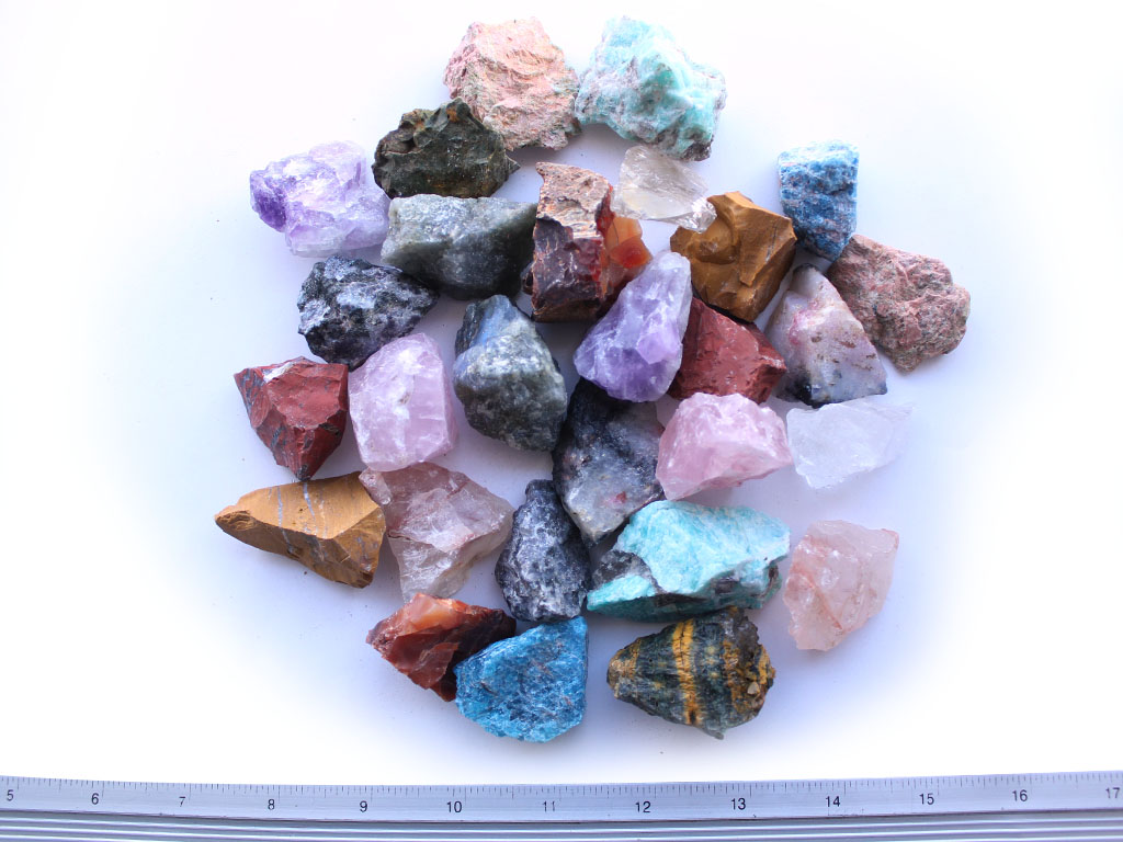 Apatite, Amazonite, Amethyst, Petrified Wood, Indigo Gabbro, Desert Jasper, Chrysophrase, Chrysocolla, Chestnut Jasper, Green Opal, Girasol, Orange Calcite, Rose Quartz, Red Jasper, Septarian, Yellow Jasper, Zebradorite