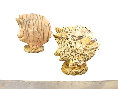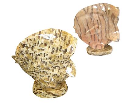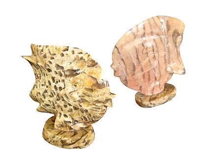 Zebradorite Sunfishes. Hand-carved by mastercarvers at our factory in Madagascar. Great Gem Decor®. You will receive your piece(s) of Zebradorite Sunfish carving(s), similar to what is photographed with this order. Discounts available for volume purchasing. Container quantities available, for those interested. For more information, please call a Madagascar Minerals® sales representative (520) 882-8884. Zebradorite isa graphic quartz. Rural miners in Madagascar came across this variety of Feldspar which they called (in French and Malagasy) "Feldspath". It'sbetter to buy your Zebradorite products from your direct source of Zebradorite.