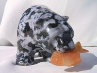 Indigo Gabbro Bear "Eating Fish". This Indigo Gabbro was mined from the Norcross-Madagascar (NMG) quarry. You will receive (1) carving with this order $411/Pc, similar to what is photographed. Discounts available for volume purchasing of this Indigo Gabbro products. Please, contact a Madagascar Minerals sales representative for more information (520) 882-8884.